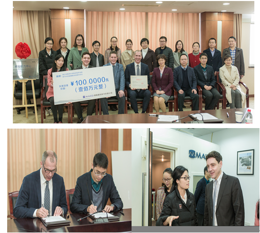 林咸明副处长代表公司对Andreas Kurzbuch一行的到来表示热烈欢迎,对德国麦科给予公司办学条件的改善和听力人才培养的大力支持表示感谢。随后林处长介绍了公司的基本情况、医学技术公司及听力与言语康复专业所取得的成绩及校企合作近况,希望医学技术公司听力与言语康复专业充分利用好这些仪器设备,建设好实验中心。德国麦科听力设备公司总经理Andreas Kurzbuch代表麦科向公司表示感谢,并介绍了麦科的理念、产品及发展愿景,表示非常愿意与公司听力与言语康复学专业继续深入合作,培养更优秀的应用型听力人才。随后,包利荣副处长和Andreas总经理分别代表双方签署捐赠协议,并向麦科颁发捐赠证书。应航经理与Andreas总经理共同为双方共建的模拟听力中心揭牌。