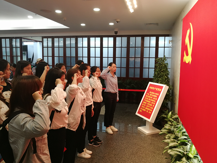 中国共产党第一次全国代表大会会址是全国爱国主义教育示范基地,是中国共产党的诞生地。员工党员随着讲解员的讲解分别参观了“中国共产党创建历史文物陈列”三部分内容,包括中国共产党成立的历史背景、中国共产党早期组织的成立及其活动、中国共产党第一次全国代表大会召开的全过程。100多平方米的展厅内陈列着中共一大13位代表的画像和一组群雕。平均年龄28岁的13位的代表们就在这栋普通的小楼里开会,无产阶级的政党就在这里诞生了。开天辟地的伟业从此开始。柔和的灯光下,这些陈旧的历史照片和文物史料,似乎又把人们带回了那段峥嵘岁月。在纪念馆宣誓厅,悬挂着巨幅中国共产党党旗。面对鲜红的党旗,丁艺雪老师带领其他员工党员同志一起重温入党誓词。
