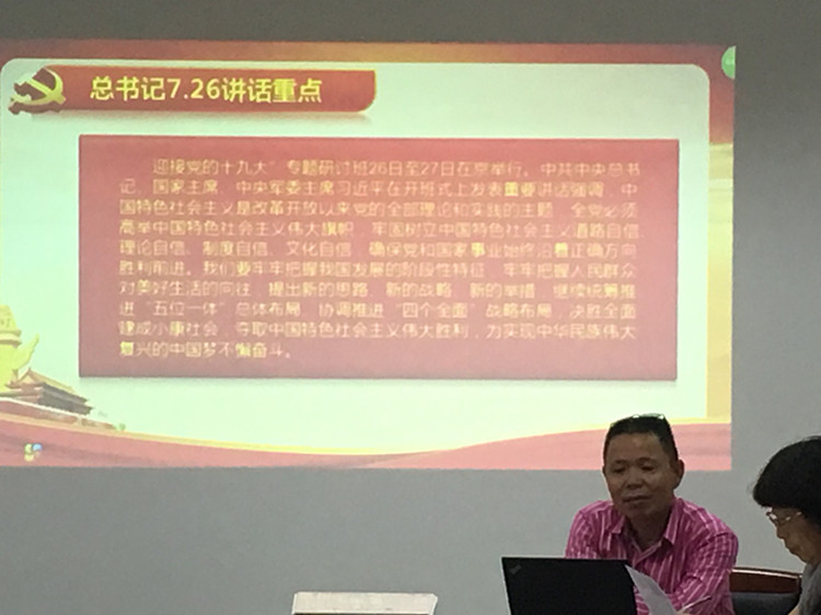 会上,彭建华书记从“总书记7.26讲话重点”、“讲话为党的十九大定调”、“党的十八大以来的5年”、“习近平总书记重要指示”等四个方面带领大家认真学习习近平总书记7月26日在省部级主要领导干部专题研讨班上的重要讲话精神。会议指出,习近平总书记在省部级主要领导干部专题研讨班上的重要讲话,深刻阐述了党的十八大以来党和国家事业发生的历史性变革,深刻阐述了新的历史条件下坚持和发展中国特色社会主义的一系列重大理论和实践问题,深刻阐明了未来一个时期党和国家事业发展的大政方针和行动纲领,提出了一系列新的重要思想、重要观点、重大判断、重大举措,具有重大的政治意义、理论意义和实践意义。