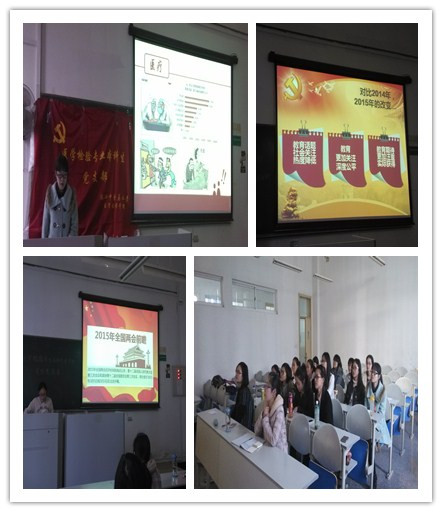 根据支部的实际情况,采用自主学习和集体学习相结合、在校支部和实习生支部互促进的方法,选择了政治(思想)、教育、环境、就业、医疗五个与老员工密切相关的主题进行讨论和学习成果分享。本次会议内容丰富,形式多样。各小组结合各自成员的特长,分工完成学习任务,通过PPT和视频资料展示,很好地对两会进行了解读,不仅从国家层面上解读了两会,更从老员工的角度很好地阐释了我们对两会的认识。