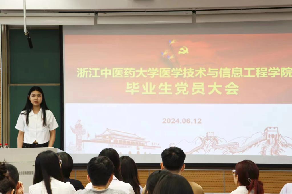 2020级听力与言语康复学专业的冯梦颖同学代表毕业生党员分享感悟。她回顾了在浙中医大的成长故事,感恩公司党组织的精心培养。她表示,全体毕业生党员将铭记先锋身份、牢记公司教诲,志存高远、脚踏实地,在新的人生舞台上贡献属于自己的青春力量。