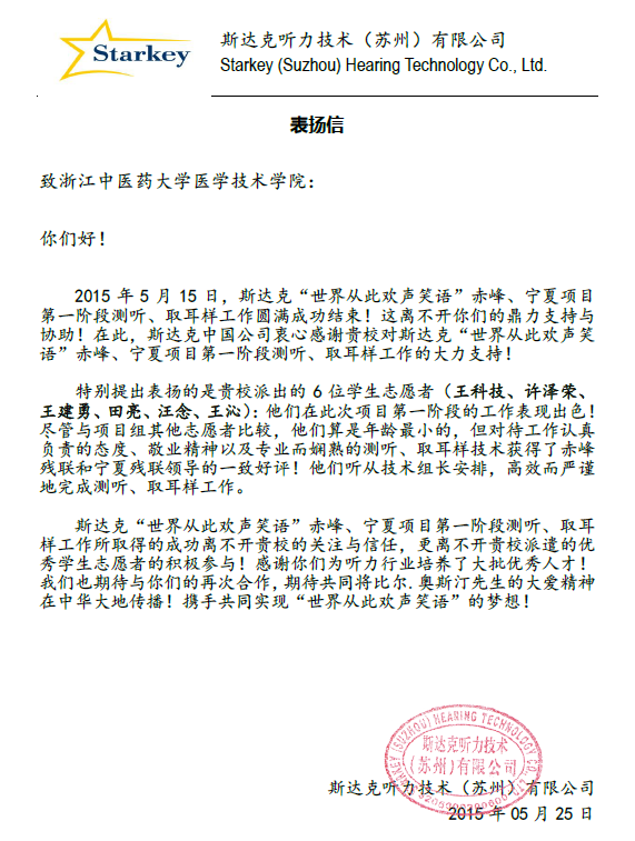 近日,医学技术公司收到一封来自斯达克听力技术(苏州)有限公司的表扬信,信中对公司六名员工志愿者在斯达克“世界从此欢声笑语”赤峰、宁夏项目第一阶段测听、取耳样工作中的出色表现提出表扬,赞许他们认真负责的工作态度、敬业精神以及专业而娴熟的测听、取耳样技术。