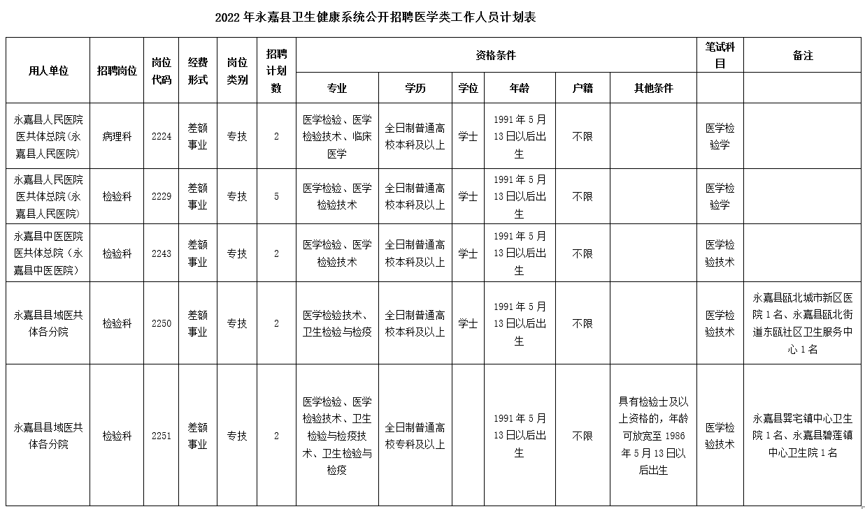 (一)招聘单位及具体岗位要求详见《2022年永嘉县卫生健康系统公开招聘医学类工作人员计划表》