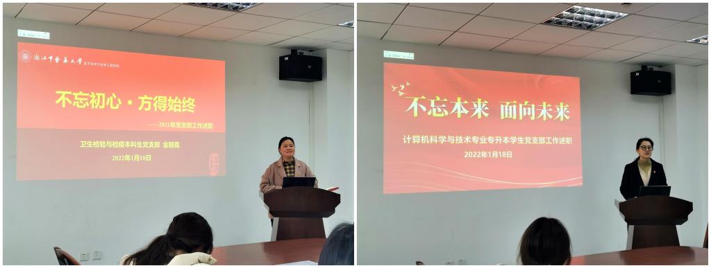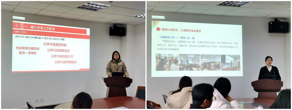 会上,肖永涛、许健和李懿等3位教工党支部书记和张婷、阮心明、金丽霞、金怡、宋腾蛟、马穎和毛卫侠等7位员工党支部书记,依次从党史学习教育开展情况、履行党建工作责情况、落实基层党建工作重点任务情况、强化政治功能、获得成果、抓思想政治工作情况以及全面推进从严治党情况等方面作了汇报,既全面总结了成绩、高度凝练了特色,又深刻剖析了存在的问题,并提出了切实可行的整改措施和2022年工作打算等。在每一位支部书记述职结束后,与会评委进行量化打分,陈青同志进行点评。