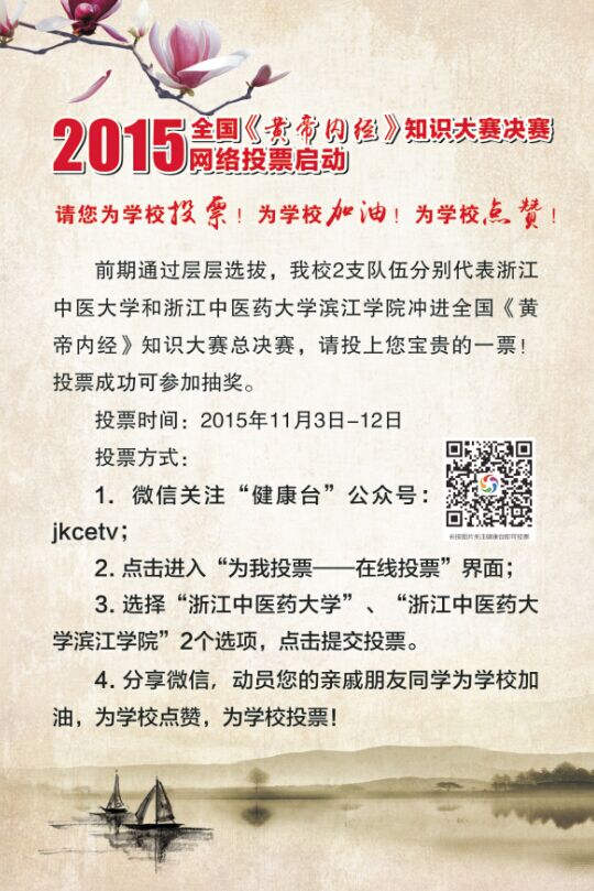 前期通过层层选拔,公司2支队伍分别代表浙江中医大学和XC体育滨江公司冲进全国《黄帝内经》知识大赛总决赛,请投上您宝贵的一票!投票成功可参加抽奖。