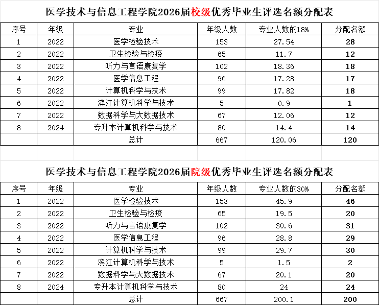 根据评选办法,名额分配如下(院级优秀本科毕业生名额包含校级优秀本科毕业生名额):