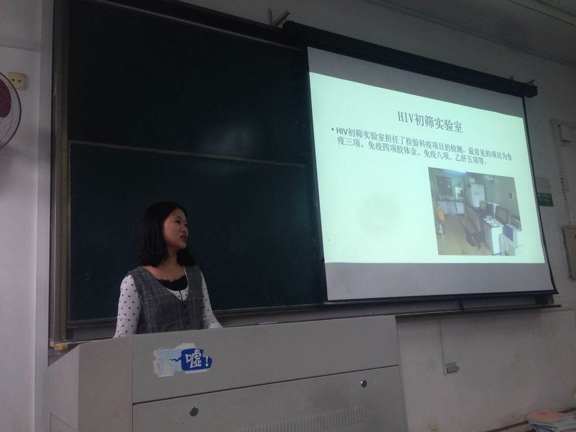 交流会上,2014级同学们以PPT展示、班组讨论和现场提问交流等形式分享了暑假期间各自的见习情况及心得体会,并开展了热烈的交流。陈江、吴悦菲吴斌、邢一帆、黄俊榜五位同学代表交流,分享了他们前往浙江、河南和广西等各地疾病预防控制中心和医院检验科的见习经历,走访了相关的科室,对疾控中心和医院检验科常规开展的工作、检测项目、常用的仪器设备有了初步认识;深入艾滋病、乙肝、沙门菌等传染病检测实验室,参与了食品、水等样品检测;系统地学习了实验室生物安全规定,提高了实验过程中自我保护的意识;学习了《中国疾病预防控制工作进展(2015)报告》,对我国公共卫生现状及国情有了了解。会上,医学技术公司丁志山副经理,给同学们分析了卫生检验与检疫专业的发展形势,鼓励大家学好理论知识的同时,多动手多实践,以更好地为社会服务。