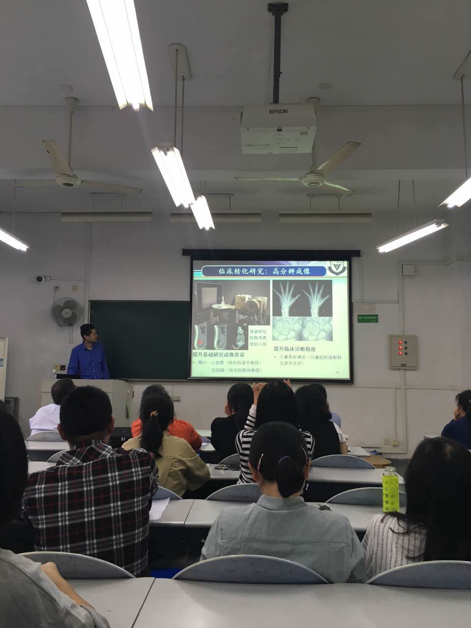 牛田野教授以术中锥束CT图像引导的重要性为切入点,对比传统诊断方法所体现的优势,以及临床应用中暴露出的问题,展开低剂量CT和定量化技术从工程到临床的讲座。在方法学研究上,分别在超低剂量双能分解,超低剂量重建,定量成像,高分辨技术方面进行了具体的阐述。随着牛教授的进一步阐述,该项技术被应用到临床,也展现了其独特的优势,其中主要领域为血管介入,高分辨成像,口腔成像,癌症筛查等。讲座尾声,华罗庚先生的一句话鼓励了在场的每一位师生:勤能补拙是良训,一份辛苦一份才。牛教授幽默风趣,层层剖析,在大家热烈的掌声中讲座落下帷幕。最后,牛教授对现场提出的问题做出了详尽的解释,让大家不论在知识领域,还是学术精神上都得到了很好的提升。
