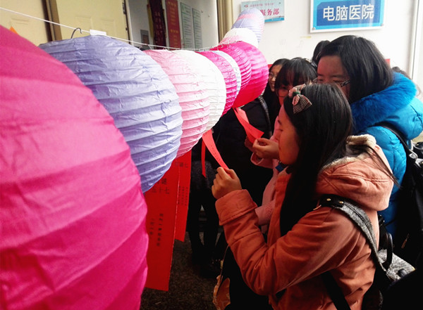 值得一提的是,3月5日正好赶上中国传统佳节——元宵节,贴心的医学技术公司员工会在电脑医院旁边举办“猜灯谜 过元宵”活动,旨在为等待电脑维修的同学提供娱乐活动,为元宵佳节不能与家人团聚的同学们传递节日的祝福。活动场地挂满了五颜六色的灯笼,印着谜面的彩色小纸条随风飘荡,显得格外温馨。同学们参加活动的热情并未受到雨雪天气的影响,现场氛围温馨且欢乐。一位陈姓同学在接受采访时说道:“我电脑开机速度非常慢,送到电脑医院维修,本来还担心等待的时间会很无聊,没想到员工会举办了猜灯谜的活动,我猜对字谜拿了小礼品,很开心。”