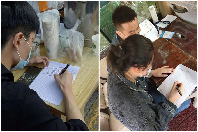 迎新当天,医学技术公司计算机专升本员工党支部的党员和入党积极分子沿袭支部的传统,在滨文校区迎新现场担任志愿者。员工党员孙博、奕永清、俞清等同志在滨文校区负责引导新生工作。三名党员利用等待新生间隙,为新生介绍公司风采、专业特色、学习经验等。他们在与新生交流中,了解到陈颖和章洲洋两位新生入党意愿非常强烈,就积极向其介绍中国共产党的光荣历史和入党流程。两位新生听取后,立即从行李箱中拿出笔纸,在党员的指导下,开始撰写入党申请书。
