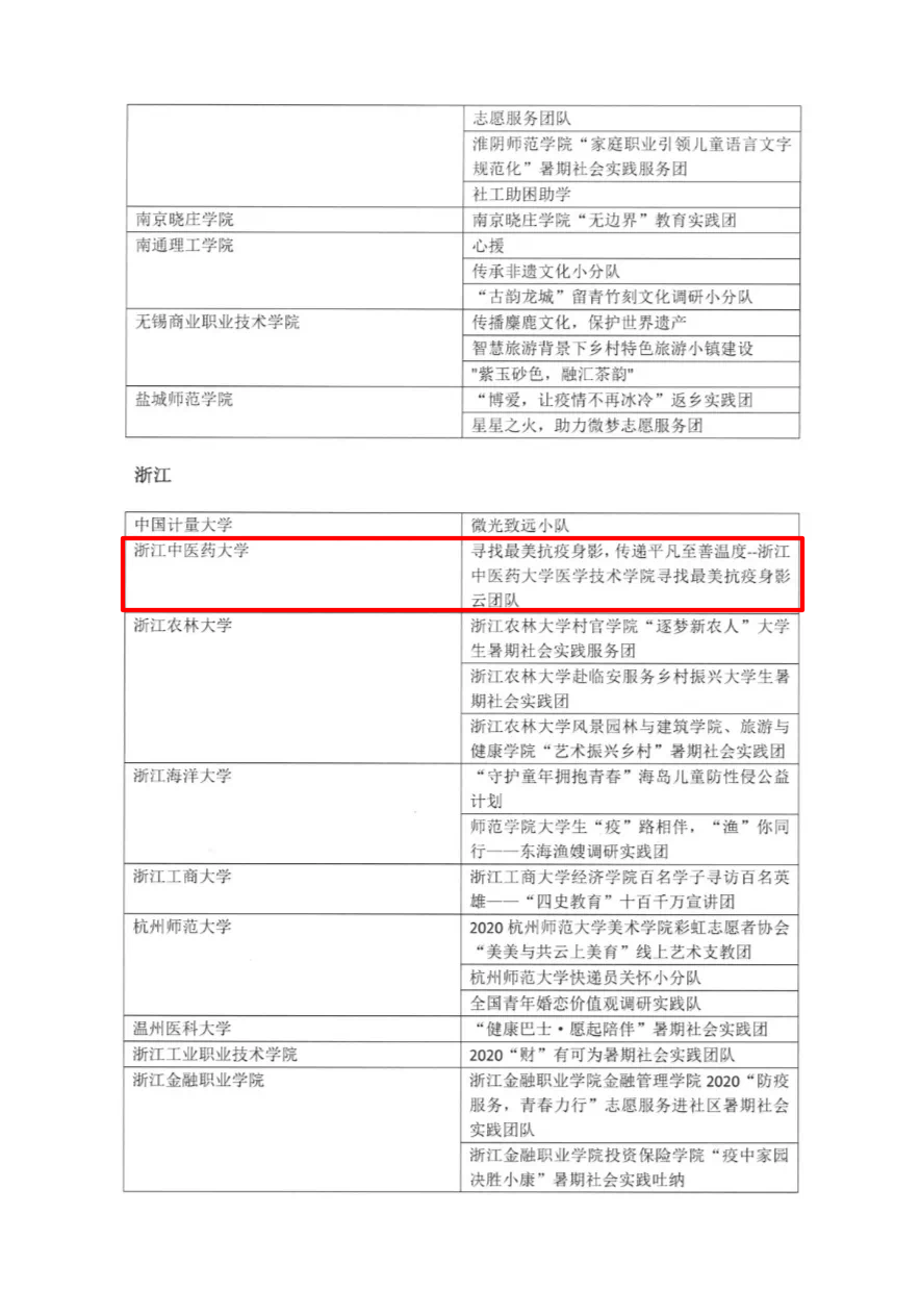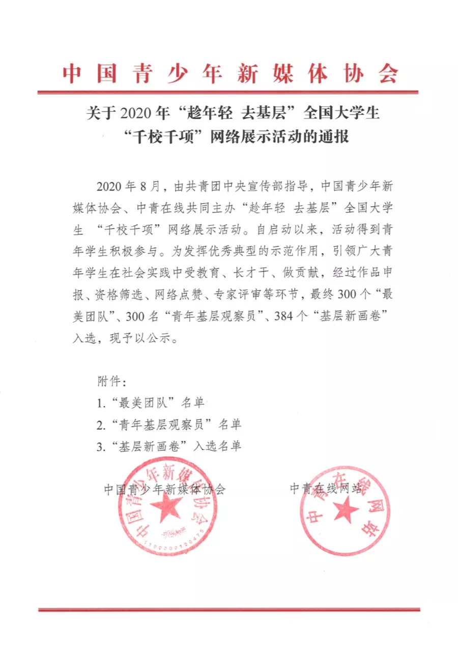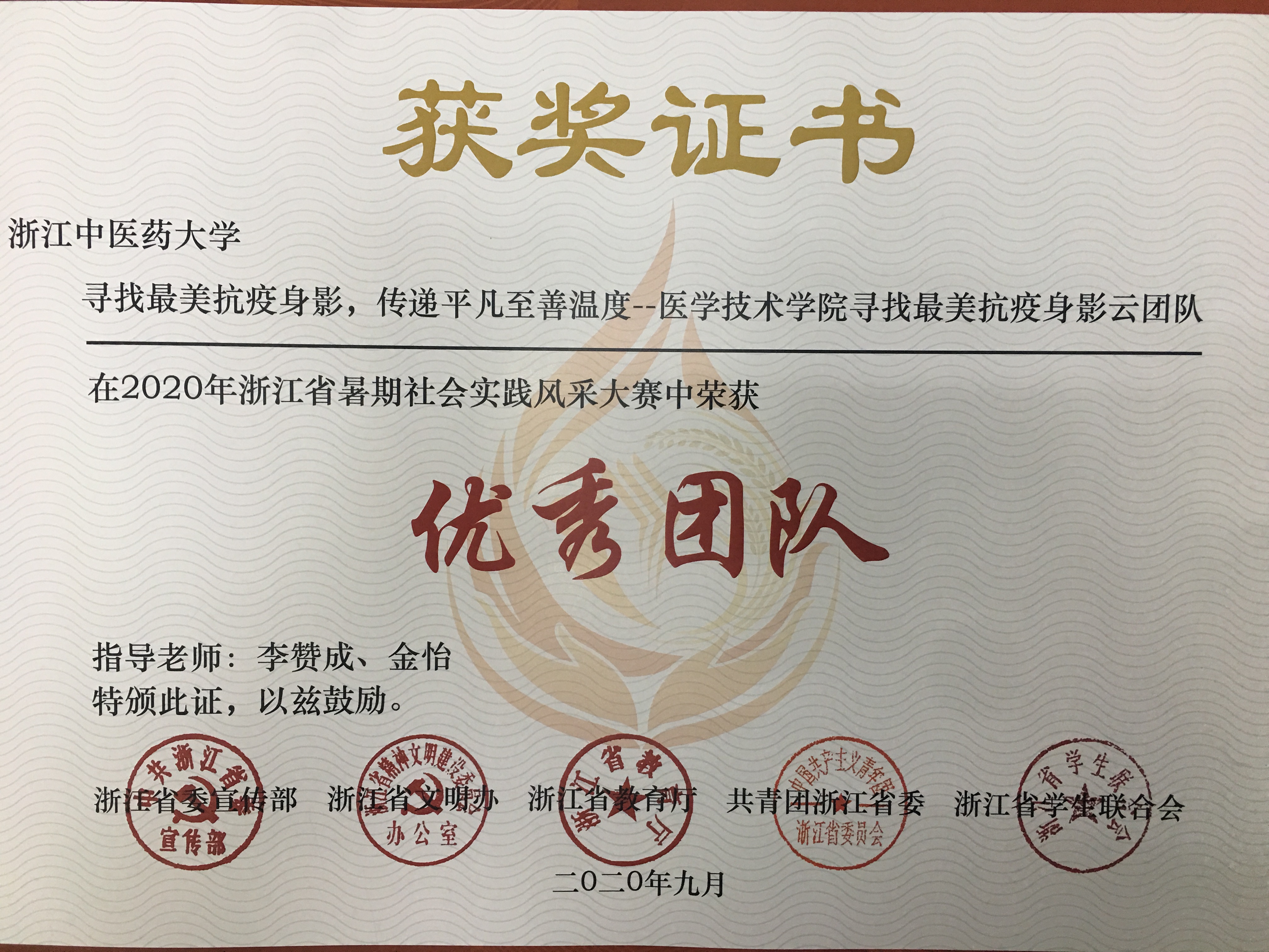日前,由共青团中央宣传部指导,中国青少年新媒体协会、中青在线共同主办了“趁年轻 去基层”全国老员工“千校千项”网络展示活动,医学技术公司暑期社会实践团队获得“千校千项”最美团队荣誉称号。同时在2020年浙江省暑期社会实践风采大赛中荣获“优秀团队”荣誉称号。