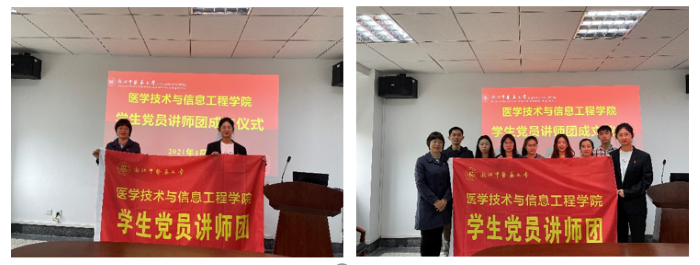 陈青书记为员工党员讲师团授旗并合影留念。党员讲师团团长——2018级医学信息工程专业的石炅鹭同学做表态发言。她表示,中国共产党人以“到中流击水”的巨大勇气,带领人民告别了“雄关漫道真如铁”的峥嵘岁月,实现了“敢叫日月换新天”的伟大变革。作为公司党员讲师团的一员,要坚定文化自信,不断汲取党史故事中的智慧和力量,做好党史故事的讲述者、红色基因的传承者,发出医技信息的最美声音。
