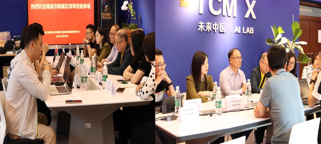 5月20日下午,南昌市新建区政协副主席熊有炳、南昌市新建区发改委副主任吴寻、南昌市新建区人社局副局长傅晓峰、南昌市新建区发改委综合股副股长熊苇、南昌市新建区人社局“招大引强攻坚”工作专班副组长邓省花、南昌市新建区营商服务中心杨文涛以及江西智东璧健康管理有限公司总裁车旭日、副总裁吴弘一行莅临公司校级研究中心——大数据与智慧健康研究中心,调研政、校、企共建“TCM X未来中医实验室”。研究中心主任李凯教授、教学科研办公室主任张婷副教授、医学信息工程教研室陈璟博士,以及附属第三医院吴斌主治医师共同参与了本次调研。会议由李凯教授主持。