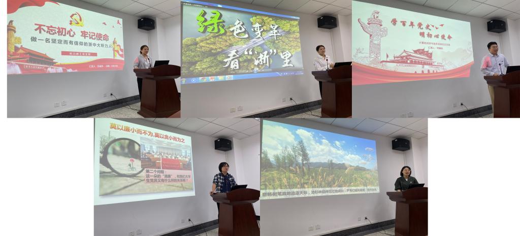 毛卫侠同志结合自己在部队的学习工作经历,重温党的光辉历程和马克思主义理论在中国的发展过程。宋腾蛟同志则通过讲述家乡宁波的新变化、新成效,切身感受建党百年的辉煌成就。阮心明同志以《新时代、新青年、新使命》为题,讲述了青年与党和国家的关系,激励广大党员干部和青年员工励志勤学、刻苦磨炼,勇于担当起新时代赋予的历史责任。田成华同志结合听力教工支部的志愿服务工作,分享了听力系全体教工党员志愿服务5年来心路历程。金丽霞同志从电视剧《啊·摇篮》丑子冈“一定要上抗大”的故事出发,分享了抗日军政大学“为党育才”办学宗旨,引领广大师生党员深刻感悟和大力弘扬抗大精神。叶小青同志结合自身专业,从一个母亲和理化任课老师的角度,讲述生态文明建设的几十年成效,“绿水青山就是金山银山”,生态文明建设功在当代、利及千秋。马颖同志以“绿色变革看浙里”为题,讲述了“求真务实、诚信和谐、开放图强”的浙江精神,秉持浙江精神,继续发挥先行和示范作用,浙江就能始终以领跑者的姿态奋进新时代、担当新使命。李懿同志则回顾了新中国汽车工业70年的发展史,共和国工业的腾飞要得益于党的领导,有了像吉利汽车这样的民族企业,从小到大,从弱到强,中国汽车强国梦正在梦想照进现实。张婷同志以“从党史学习教育中汲取清廉力量”为题,以机体来比拟党组织,全身血管和组织器官来比拟党员同志和人民群众,只有廉洁自律保持血管畅通、组织器官良好运作、人民群众安居乐业,才能有蒸蒸日上的国家。