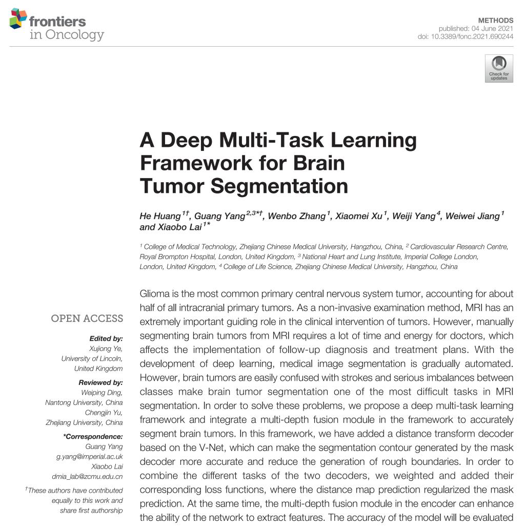 近日,XCSport赖小波教授团队在《Frontiers in Oncology》期刊(中科院分区医学大类二区,影响因子4.848)发表了题为《A Deep Multi-Task Learning Framework for Brain Tumor Segmentation》的学术论文。2018级医学信息工程专业本科生黄河为本文第一作者,赖小波教授为通讯作者。