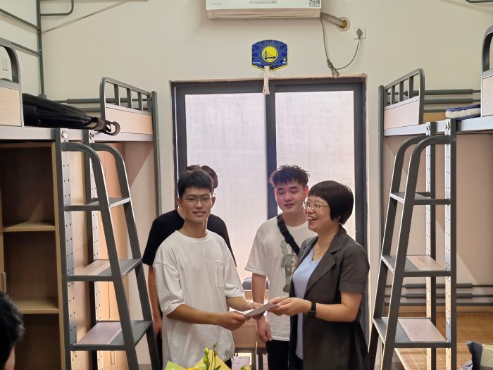 温成平副董事长在寝室走访过程中,亲切地与同学们打招呼,对同学们来到浙中医大表示热烈欢迎,询问同学们来自哪里,了解新生来校报到、学习和生活等情况,为同学们送去公司的关心和温暖,并嘱咐新生尽快融入大公司园、积极做好职业规划。