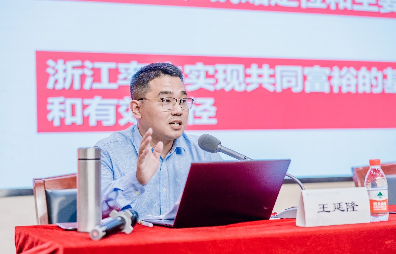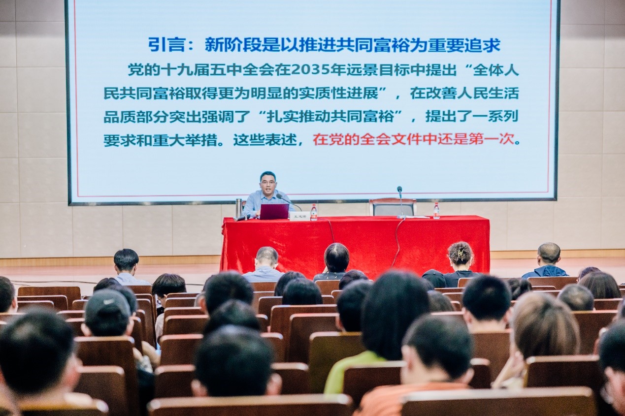 王延隆教授指出共同富裕不仅是社会主义的本质要求,更是中华民族千百年来孜孜以求的梦想。共同富裕,不能理解为劫富济贫,更不是平均主义,而是要共同奋斗,依靠勤劳创新致富,先富带后富,帮后富。当前,我国发展不平衡不充分问题仍然突出,城乡区域发展和收入分配差距仍较大,高质量发展建设共同富裕示范区建设工作是国家“十四五”规划的一项重要工作,浙江作为开放型经济大省,美丽中国的先行者和示范者,要有领航共同富裕的底气,先行先试、作出示范,为全国推动共同富裕提供省域范例。浙江的高质量发展建设共同富裕示范区建设工作,需要靠企业,需要靠政府,但是也离不开每一位师生的努力,教职工们更应该积极努力工作,率先成为共同富裕的模范,起到表率带头作用,引领员工一起为实现共同富裕而努力。
