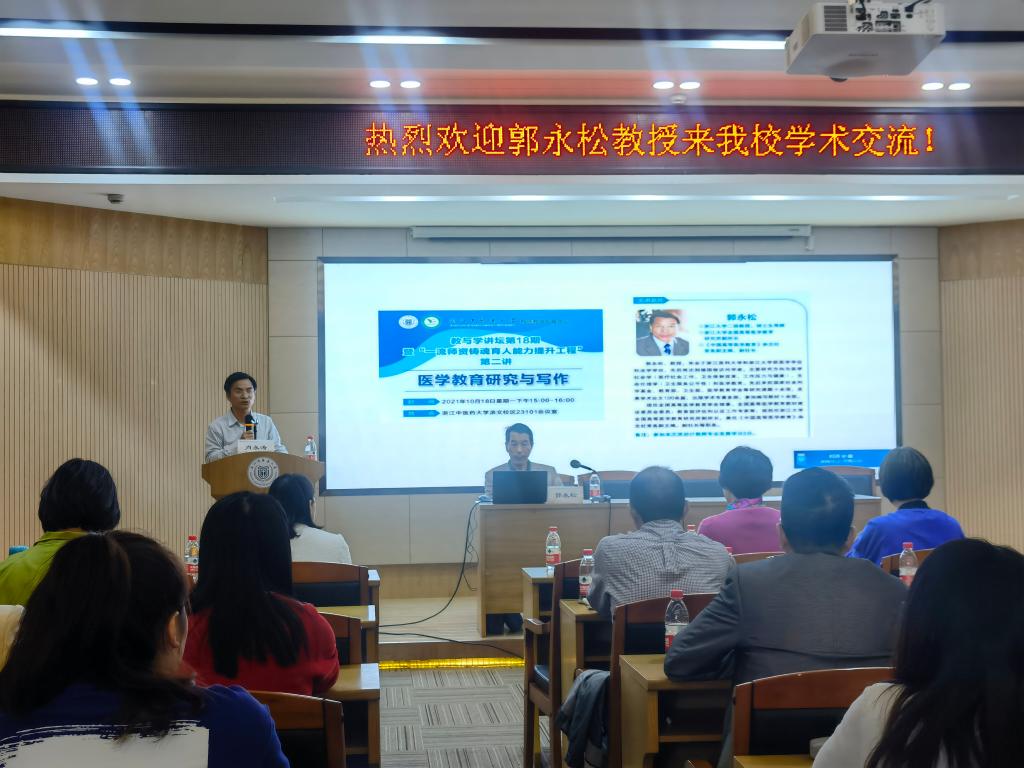 为推进公司一流专业建设、提升教学项目申报质量、促进一流的教学研究,2021年10月18日下午,公司与公司教师教学发展中心联合举办教与学讲坛第18期暨“一流团队铸魂育人能力提升工程”第二讲,邀请全国高等医学教育研究所副所长、《中国高等医学教育》杂志社常务副主编、副社长、浙江大学二级教授郭永松教授在23号楼23101会议室作题为《医学教育研究与写作》的讲座。公司经理丁志山、书记陈青、副经理赖小波和肖永涛以及公司教学管理人员、公司教师代表以及全校重大招标课题相关负责人、其他公司老师等参加了会议。钉钉线上四群联播有近200余人聆听了讲座。会议由公司副经理肖永涛主持。