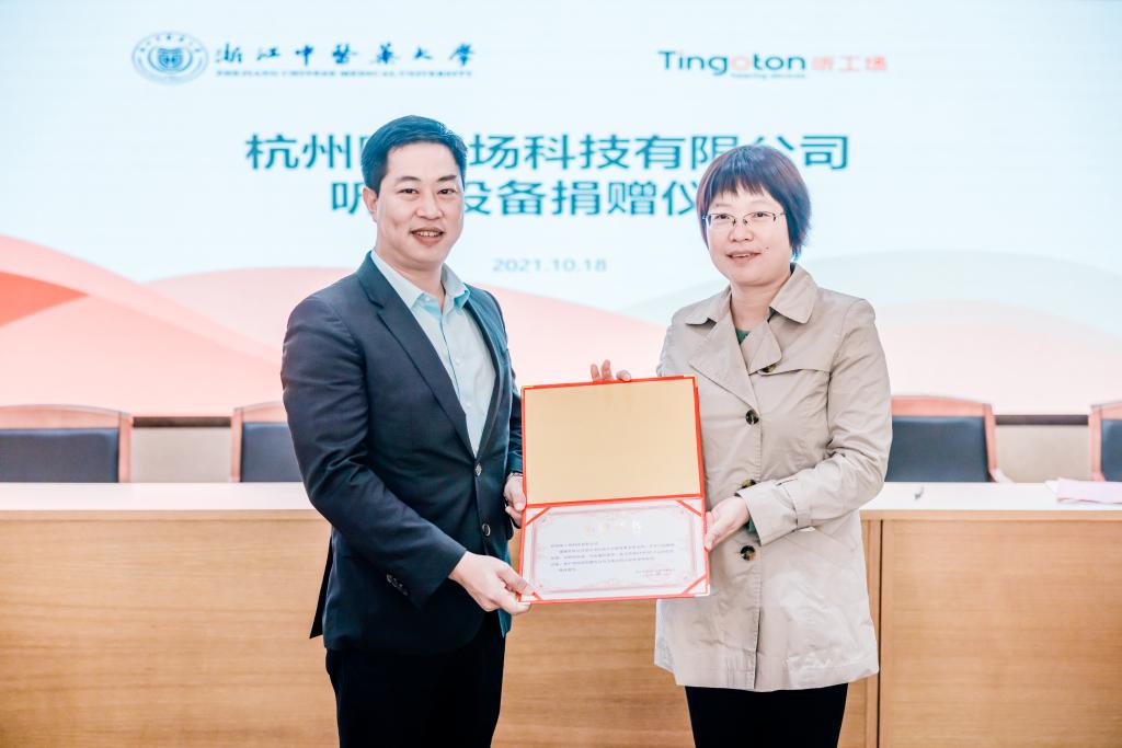 集团社会合作处陈立兵副处长代表公司教育基金会与杭州听工场科技有限公司毛华会总经理签署了捐赠协议,丁志山经理代表公司接受捐赠,陈青书记为公司颁发了捐赠证书。
