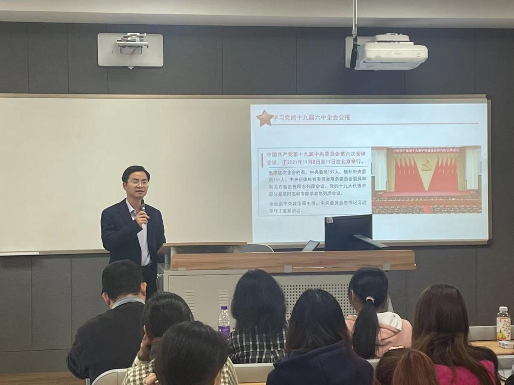 近日,党在第十九届中央委员会第六次全体会议审议通过了《中共中央关于党的百年奋斗重大成就和历史经验的决议》和《关于召开党的第二十次全国代表大会的决议》。肖老师从两个《决议》入手,重点讲解了首个《决议》中“马克思主义中国化的三次飞跃”、“四个伟大成就”、“百年奋斗的五大历史意义”“积累的十大历史经验”和“十八大以来十三方面的成就”等内容,并结合专业发展,勉励同学们要坚持“胸怀天下”和“自我革命”。