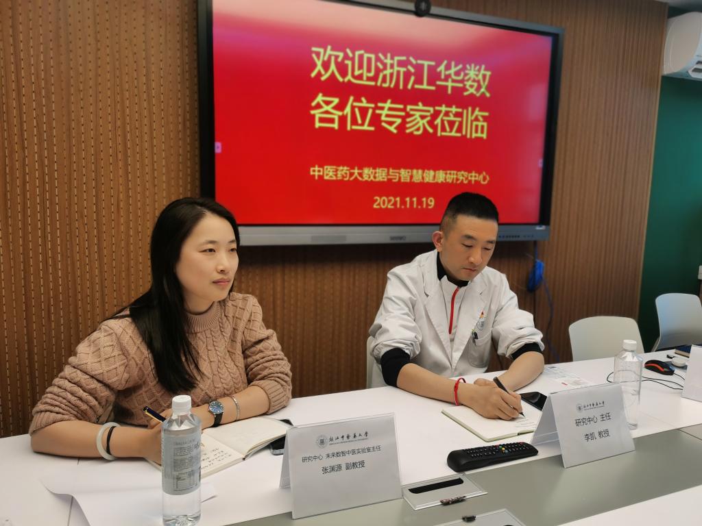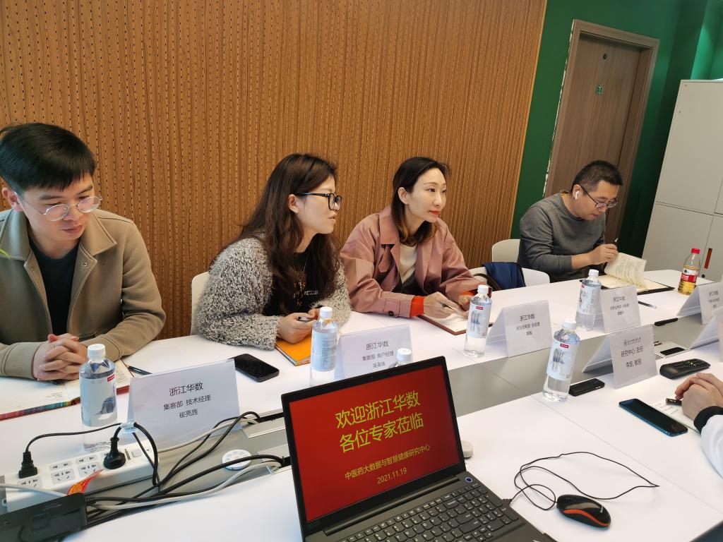 2021年11月19日下午,浙江华数广电网络股份有限公司(以下简称“浙江华数”)民生服务部总经理黄敏、集客部客户经理吴美珠、集客技术经理崔亮旌、创新业务经理盛涛到公司中医药大数据与智慧健康研究中心实地调研“未来社区”中医数智健康服务产品研发情况。公司中医药大数据与智慧健康研究中心主任李凯教授、未来数智中医服务PI张渊源副教授参加了本次调研。