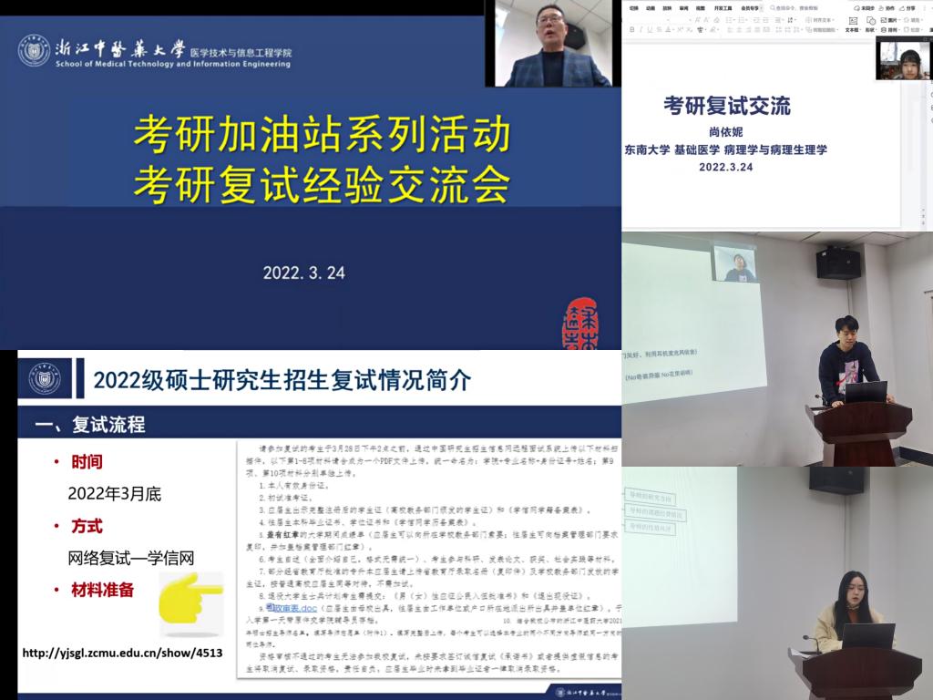 会上,丁志山经理介绍了公司学子今年考研情况和研究生招生复试管理相关规定,表达了对成功进入复试的同学的祝贺,预祝他们在复试环节取得优异的成绩;陈瑾老师结合前几年公司研究生招生情况,梳理了2022年研究生复试流程、注意事项及场地要求等情况,并叮嘱同学们沉着冷静应对各种突发情况;尚依妮(原公司21届医学检验技术专业毕业生、现为东南大学21级病理学专业研究生)、郑宇扬(公司21级医学技术专业研究生)、王羽佳(公司21级中医药信息学专业研究生)三位学长学姐分别从中英文复试技巧、专业知识准备和应对策略、考研调剂技巧和注意事项等方面进行了分享。
