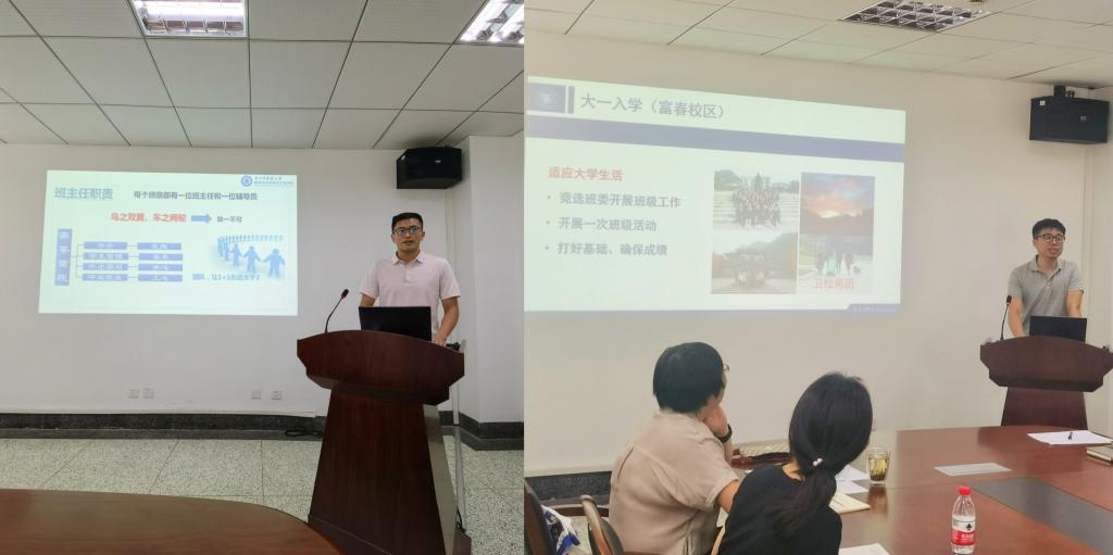 接下来,辅导员吴艇结合新生班主任的选聘工作,介绍了班主任角色定位,十项基本职责、班主任选聘条件和考核制度等内容,向与会班主任传递了角色中的幸福感和成就感。2018级卫生检验与检疫2班班主任朱炳祺作为班主任代表分享班主任工作经验。朱老师以图文并茂的形式介绍了他帮助班级同学在适应老员工活、接触专业学习、明确目标方向、找到个人归属等四个方面所做出的努力和收获,得到与会班主任的一致赞扬。随后,学工办主任金丽霞就迎新工作、始业教育安排及班级建设等近期班级工作做了详细的讲解。