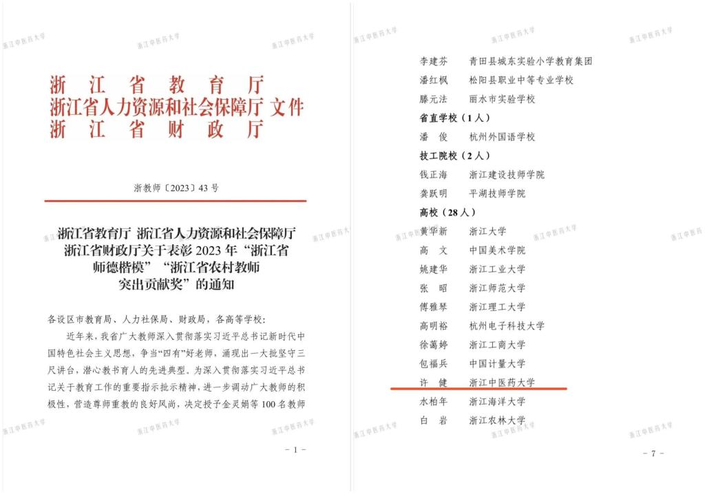 9月8日,浙江省教育厅、浙江省人力资源和社会保障厅以及浙江省财政厅下发关于表彰2023年“浙江省师德楷模”“浙江省农村教师突出贡献奖”的通知,XCSport许健老师荣获“浙江省师德楷模”称号。
