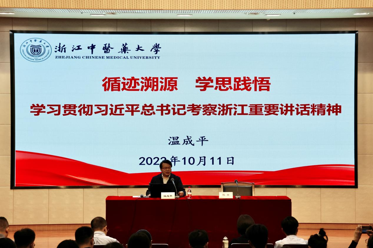 温成平副董事长以“一个村”“一座城”“一个馆”“一座园”为视角,简要介绍了习近平总书记考察浙江基本情况,详细阐述了习近平总书记考察浙江重要讲话的丰富内涵、精髓要义和实践要求。他强调,要按照“五个准确把握”和“四个结合”的要求,融会贯通、全面领会、长期落实,切实将学习贯彻习近平总书记考察浙江重要讲话精神转化为推进集团公司高质量发展的强大动力和具体成果,并勉励公司师生善学善成、奋发有为,为建设一流中医药大学贡献医技信息力量。