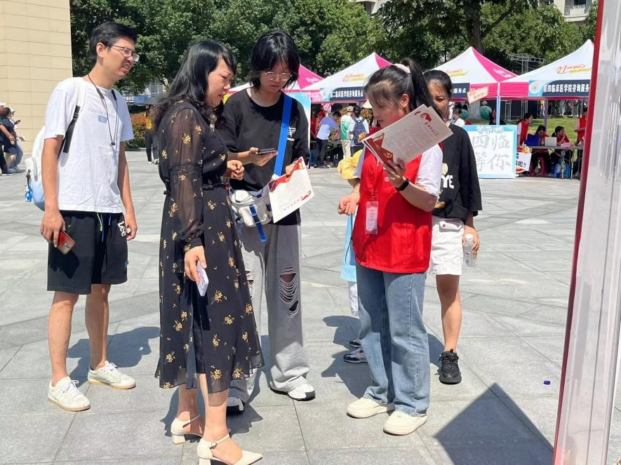上午,志愿者们顶着烈日帮新同学办手续、拿行李。在服务过程中,他们自豪地表示自身是作为一名入党积极分子来为大家服务的,并将宣传单推荐给新同学,为新生和家长解答入党相关的问题。