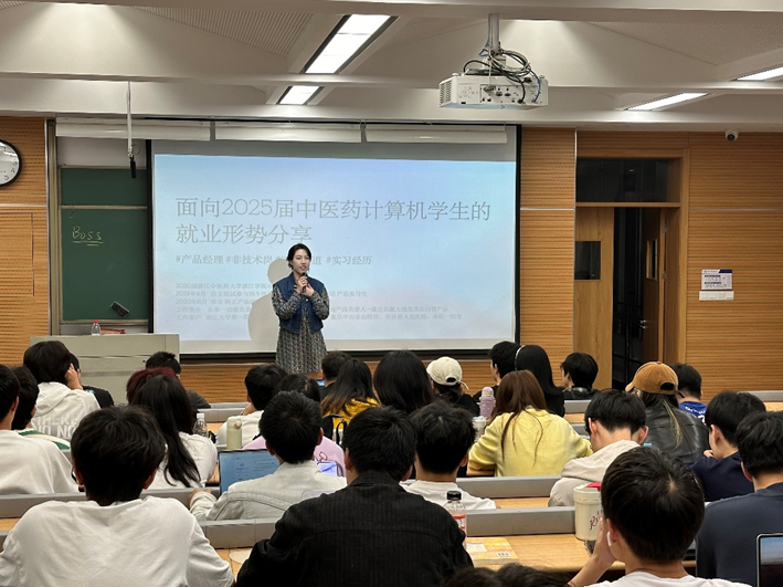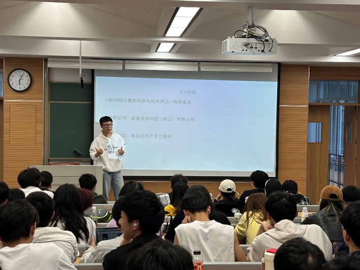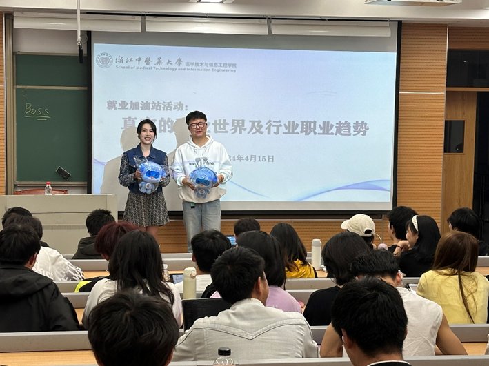 吴承祖目前就职于美国道富银行应用开发工程师岗位,他从计算机科学与技术专业当前就业形势和前景展开,介绍了计算机行业岗位细分及所需专业技能,鼓励学弟学妹们从整合专业知识、考取资格证书、主动了解市场和制作简历等方面着手,积极做好求职准备。竺佳慧担任熙牛医疗科技(浙江)有限公司产品经理,她分享了非技术岗实习和工作经验,并列举中医药大学信息专业员工在医疗信息赛道上工作的独特优势,鼓励同学们积极参加实习,积累面试经验,增加自己的职场体验。现场同学积极提问,两位员工耐心答疑解惑。