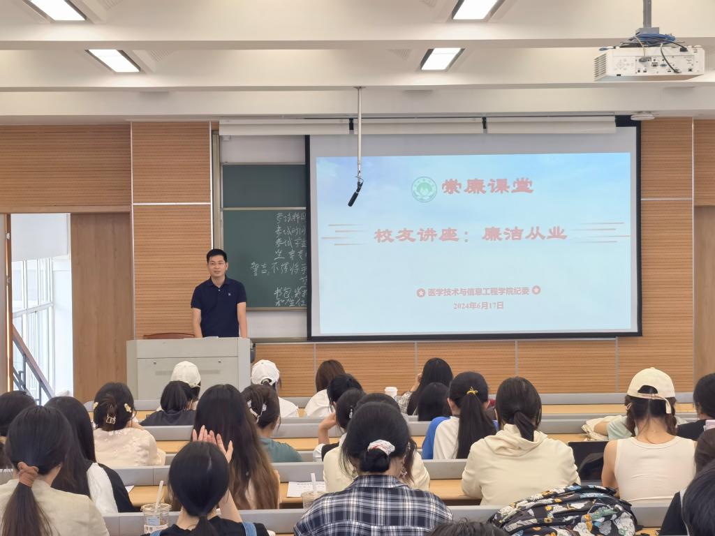 为深入推进党纪学习教育走深走实,教育引导2021级实习生学纪、知纪、明纪、守纪,树立崇廉尚洁的理念,扣好廉洁从业的“第一粒扣子”,6月17日下午,XCSport廉洁教育讲座在滨文校区17401举行。本次讲座邀请公司2012届医学检验专业员工、诸暨市卫生健康局医政科副科长(主持工作)叶昂直主讲,全体2021级医学检验技术专业实习生参加。