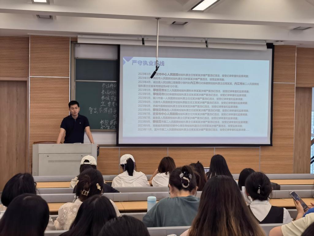 叶昂直从医院管理视角,阐述医学检验专业员工的职业路径、职业能力和执业底线,围绕“如何扣好廉洁从业的第一粒扣子”这一问题,用丰富的案例和生动的故事,深入浅出地讲解了明规守纪、立德修身、筑牢廉洁防线的重要性。进一步地,剖析了近年来发生的检验从业人员违纪违法的典型案例,以此警示同学们要时刻保持清醒的头脑,严守廉洁自律的底线。最后,还勉励全体实习生秉持初心、坚守清廉底线,以廉为范、筑牢廉洁防线,立德修身、磨砺清廉本色,勇担时代重任。